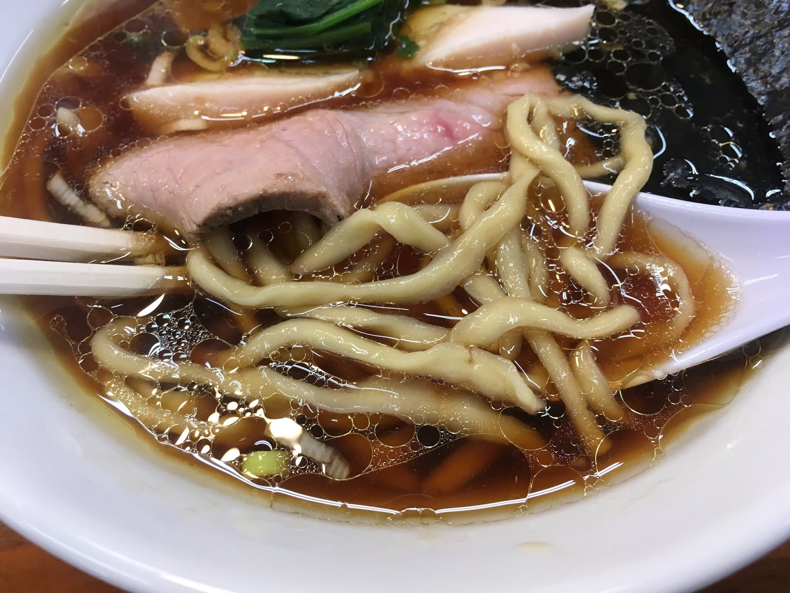綺麗な醬油スープ、短く切られたほうれん草、2種類のチャーシュー、